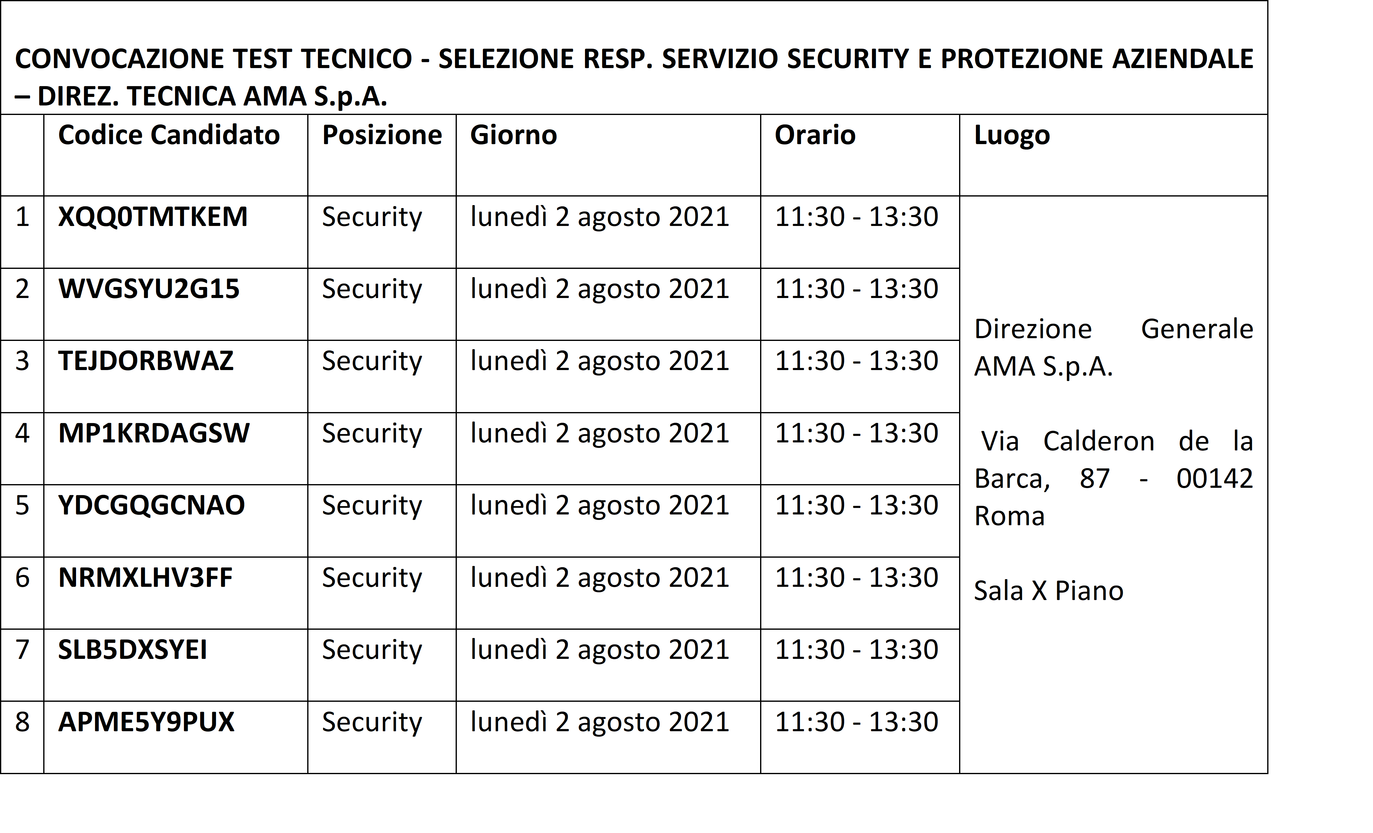 Si comunica che, a conclusione dell’iter selettivo per la posizione di Responsabile Servizio Security e Protezione Aziendale - Direzione Tecnica AMA S.p.A., non è stato individuato alcun candidato idoneo alla copertura del ruolo.