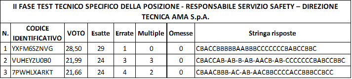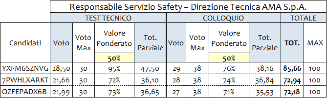 Di seguito si riporta la graduatoria finale, limitata ai soli candidati ritenuti idonei, della Selezione Responsabile Servizio Safety – Direzione Tecnica AMA S.p.A.