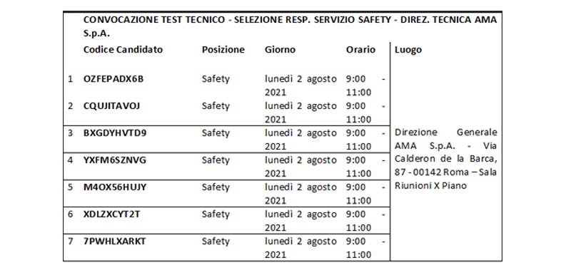 Di seguito, si riporta, per la Selezione del Responsabile Servizio Safety, l’elenco dei candidati che, a seguito dello screening di dettaglio delle dichiarazioni rese in ordine al possesso dei requisiti minimi richiesti nello specifico Job Posting, sono stati ammessi a tale fase, nonché la data, l’ora e il luogo dello svolgimento della stessa.