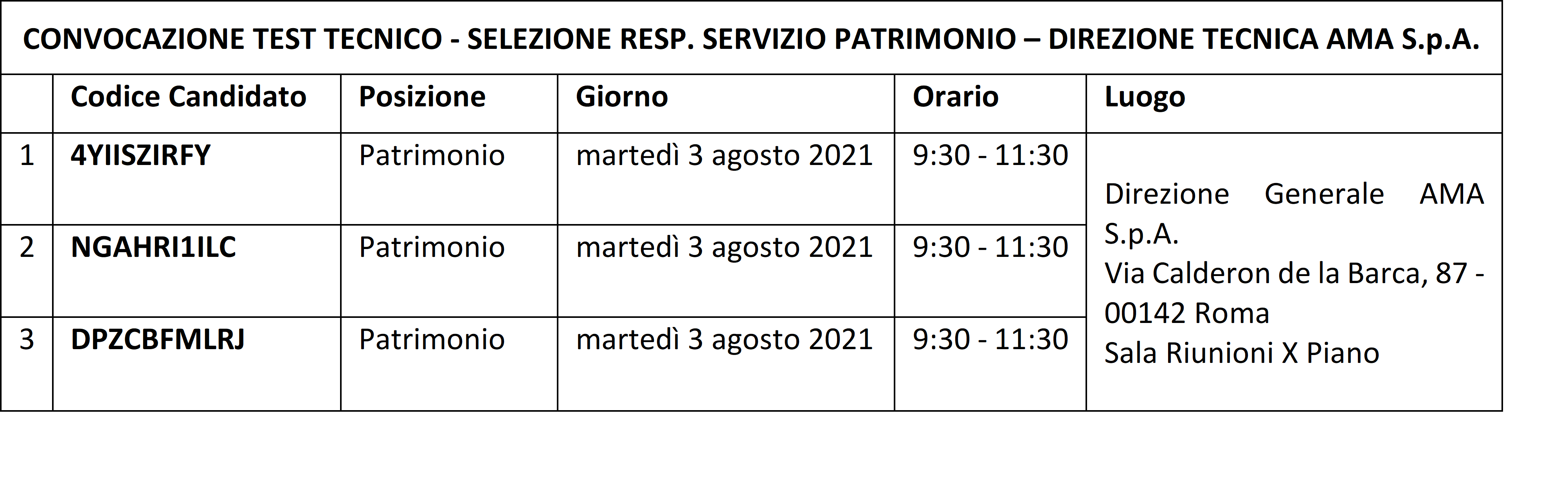 Si comunica che, a conclusione dell’iter selettivo per la posizione di Responsabile Servizio Patrimonio - Direzione Tecnica AMA S.p.A., non è stato individuato alcun candidato idoneo alla copertura del ruolo.
