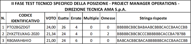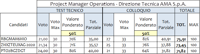 Di seguito si riporta la graduatoria finale, limitata ai soli candidati ritenuti idonei, della Selezione Project Manager Operations - Direzione Tecnica AMA S.p.A.