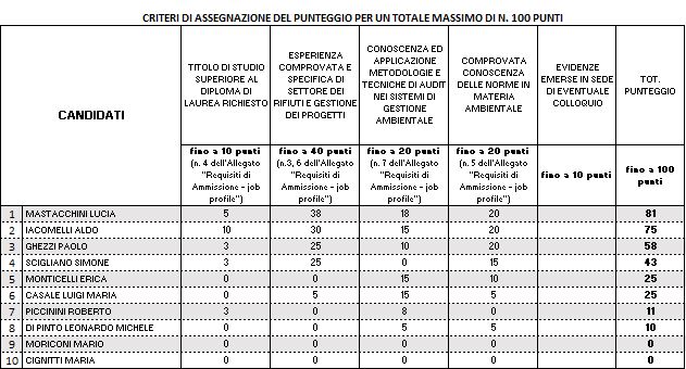 A seguito della selezione pubblica per titoli per la posizione di Consulente Specializzato Internal Audit di AMA S.p.A. si pubblica di seguito la tabella con la graduatoria dei risultati