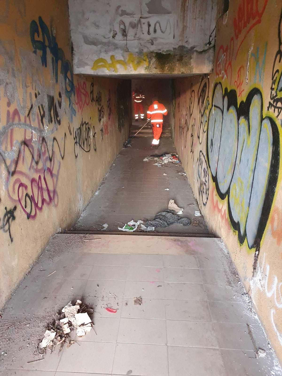 Nel secondo intervento 3 operatori, con l’ausilio di 1 mezzo a vasca, hanno effettuato la pulizia e la sanificazione con l’impiego di enzimi del sottopasso che collega via Flaminia a via Carlo Emery (Municipio XV).
