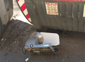 Dopo l’incubatrice trovata e rimossa in via Giambattista Gaulli in zona Vigna Murata (Municipio VIII), un nuovo e pericoloso oggetto ingombrante, in questo caso un’affettatrice professionale per salumi, deturpava il suolo pubblico davanti a una postazione di cassonetti stradali, in perfette condizioni di decoro, in via Baldo degli Ubaldi (Municipio XIII). A fotografare questo rifiuto singolare, che rientra nella gamma delle apparecchiature elettriche ed elettroniche, sono stati i tecnici AMA che monitorano ogni giorno il territorio. L’insolito “ingombrante” è stato subito inserito nel prossimo itinerario delle squadre che battono a tappeto tutti i Municipi per rimuovere i materiali scaricati illegalmente su strada.
