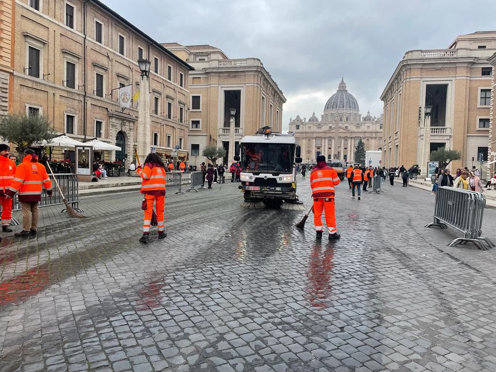 Operativa già dalle prime ore di questa mattina la speciale task force predisposta da AMA per presidiare le aree coinvolte dalle celebrazioni delle esequie del Papa emerito Benedetto XVI. L’azienda ha messo in campo complessivamente 100 operatori con l’ausilio di 30 mezzi (veicoli a vasca, spazzatrici, lava-strade, ecc.) in aggiunta a squadre specializzate dell’Unità Decoro che hanno garantito il lavaggio e la sanificazione dei luoghi.