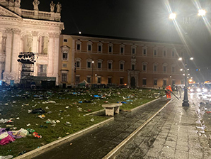 Dalle prime ore di questa mattina sono state effettuate operazioni di igienizzazione e sanificazione presso le zone adiacenti San Giovanni in Laterano, la Stazione Termini ed altri siti coinvolti dall’afflusso e deflusso delle persone. Interventi mirati di pulizia hanno riguardato anche l’area verde antistante la Basilica mentre ulteriori attività di rifinitura proseguiranno fino al completo smontaggio del palco. Nel corso della giornata verrà inoltre completato il riposizionamento di cassonetti/campane stradali precedentemente rimossi su disposizione delle Autorità di Pubblica Sicurezza.