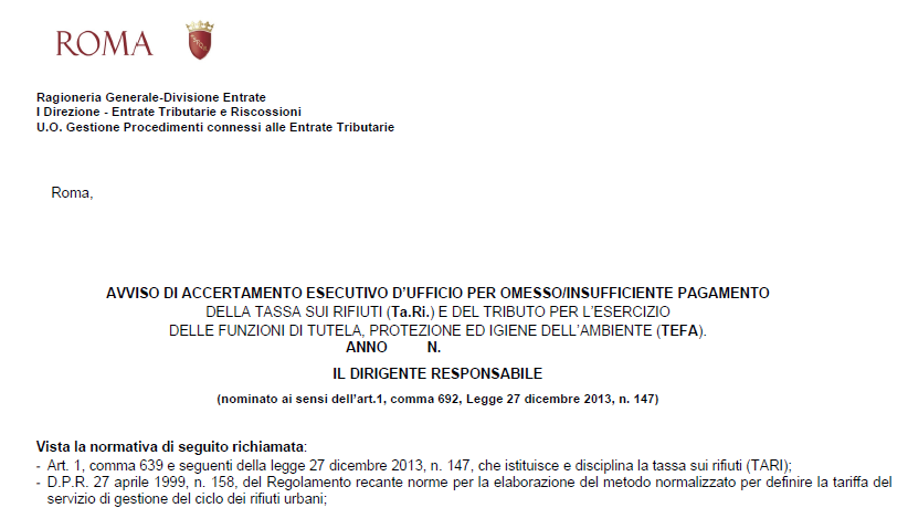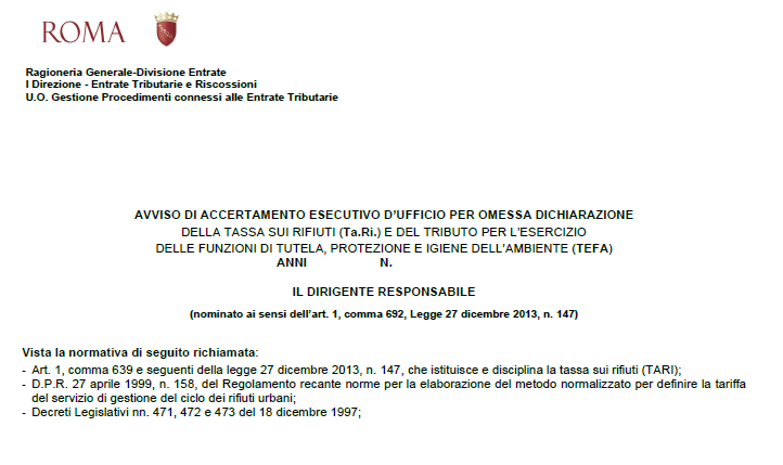 Atti amministrativi con i quali Roma Capitale, nella qualità di Ente Titolare del Tributo, con il supporto di AMA, accerta:- la violazione tributaria di “omessa dichiarazione” ai fini della Ta.Ri., liquidando il tributo dovuto comprensivo di sanzioni e interessi come previsto dalla vigente normativa.