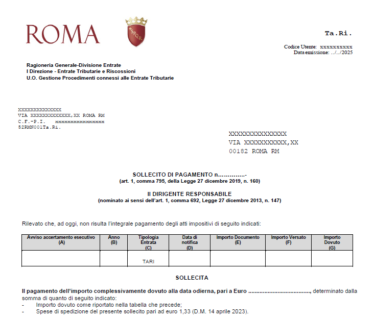 Atti amministrativi con i quali Roma Capitale, nella qualità di Ente Titolare del Tributo, con il supporto di AMA, accerta:- la violazione tributaria di “omesso/tardivo pagamento” della Ta.Ri., liquidando sanzioni e interessi.