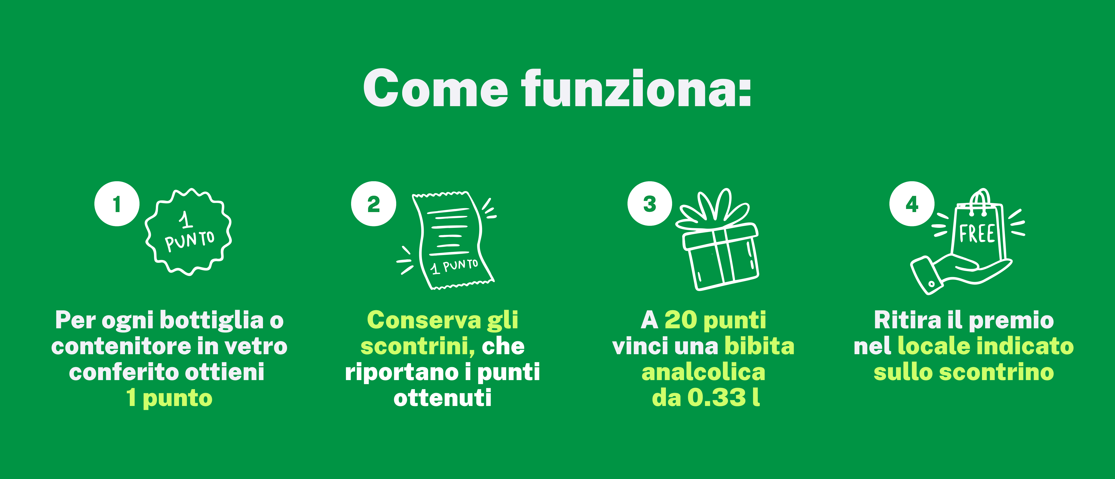 - Ogni volta che inserisci una bottiglia o un contenitore in vetro, ricevi 1 punto digitale.