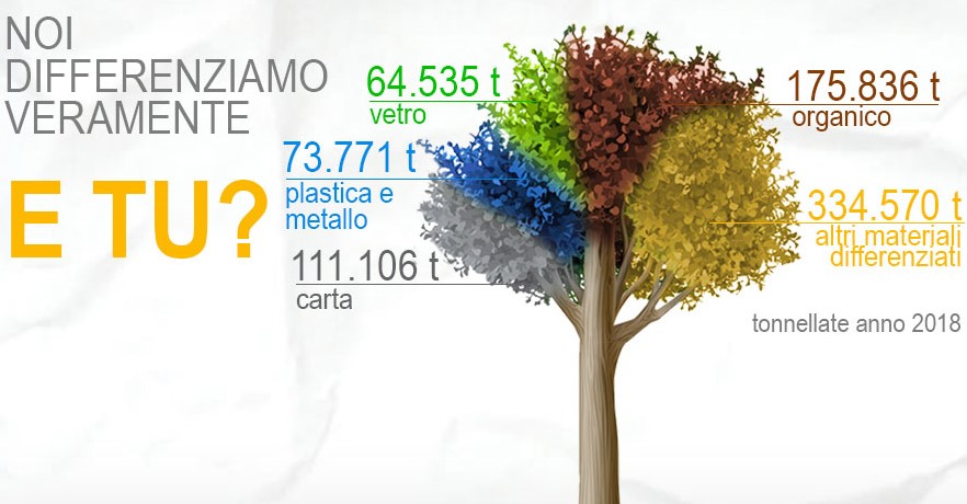 Nel 2018 abbiamo raccolto quasi 760 mila tonnellate di materiali provenienti dalla raccolta differenziata, sia con la modalità di raccolta porta a porta che dai cassonetti stradali.